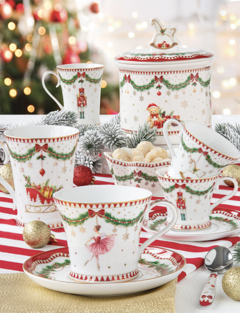 Wat deze collectie zo bijzonder maakt, zijn de verfijnde details. Elk bord, kopje en schoteltje vertelt een verhaal. De dansers in hun delicate poses, de groene kersttakken, de sprankelende sneeuwvlokken, en de gouden details laten elk stuk stralen. Het is alsof je een kerstscène uit een sprookje op tafel zet, waarin de notenkraker waakt en de ballerina haar betoverende pirouettes draait onder een hemel van fonkelende sterren. Het rood, groen en goud zijn klassiek en toch levendig, en roepen beelden op van een gezellige kerstavond bij een knapperend haardvuur.