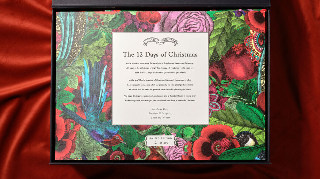 De 12 Days of Christmas Adventskalender van Chase and Wonder is beschikbaar via hun website. Haal hem in huis en begin vanaf 12 dagen voor kerst met aftellen op een manier die je zintuigen prikkelt en het feestseizoen stijlvol inluidt.