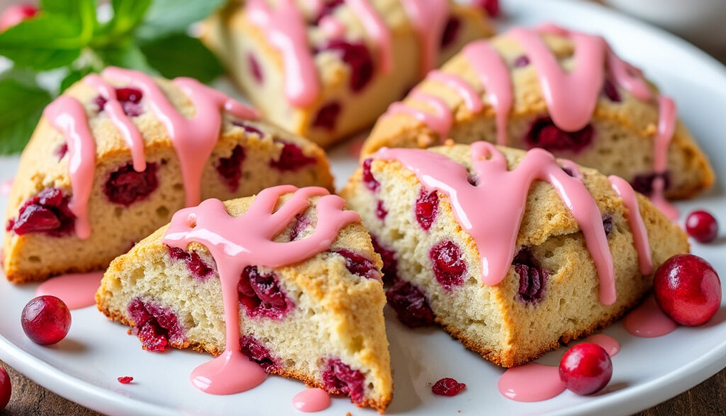 De Cranberry Scones zijn een heerlijk ontbijt om je dag feestelijk te beginnen. Deze scones zijn gevuld met zoetzure cranberry’s en afgewerkt met een frisse cranberry-glazuur. Het mooie aan dit recept? Je kunt de scones van tevoren voorbereiden en ze direct vanuit de vriezer bakken wanneer je ze nodig hebt! Perfect voor een rustige zondagochtend of als je indruk wilt maken met een zelfgemaakt ontbijtje. Serveer ze met een kopje thee voor de ultieme ochtendtraktatie!