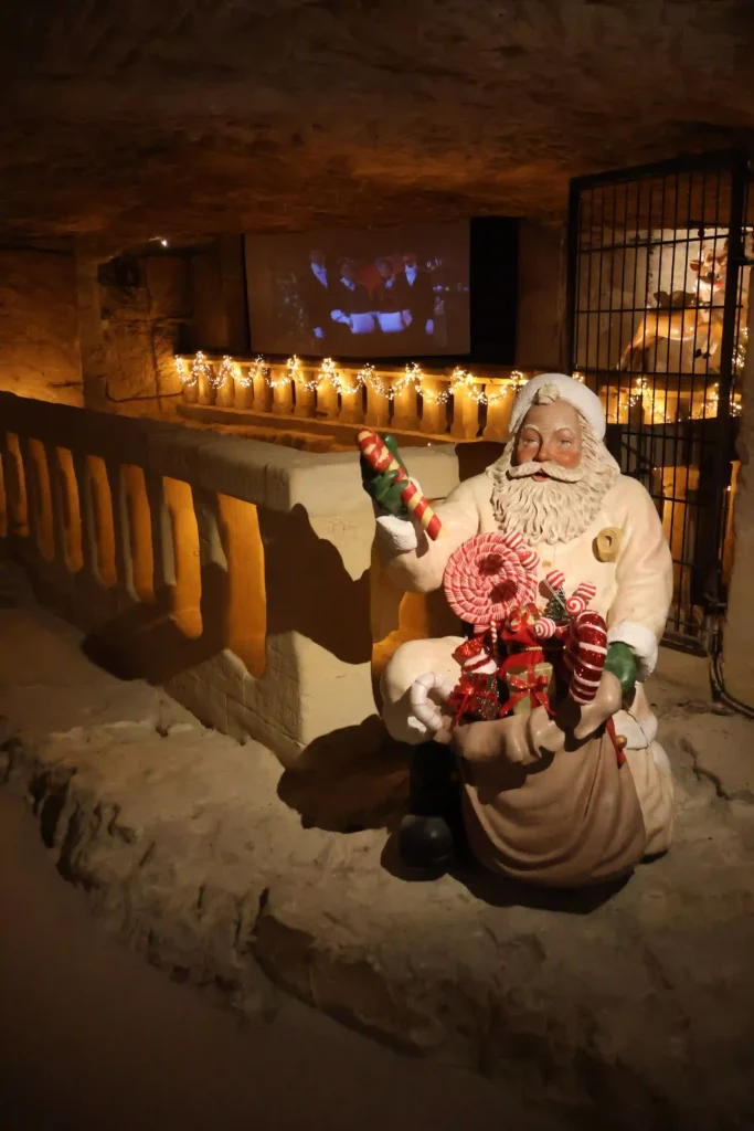 Toen we de grot binnengingen, hielden we even onze adem in. Het labyrint van mergelgangen was omgetoverd tot een kerstwereld. Overal waren versierde hoeken, duizenden lichtjes, en gezellige stands met ambachtelijke spullen.
