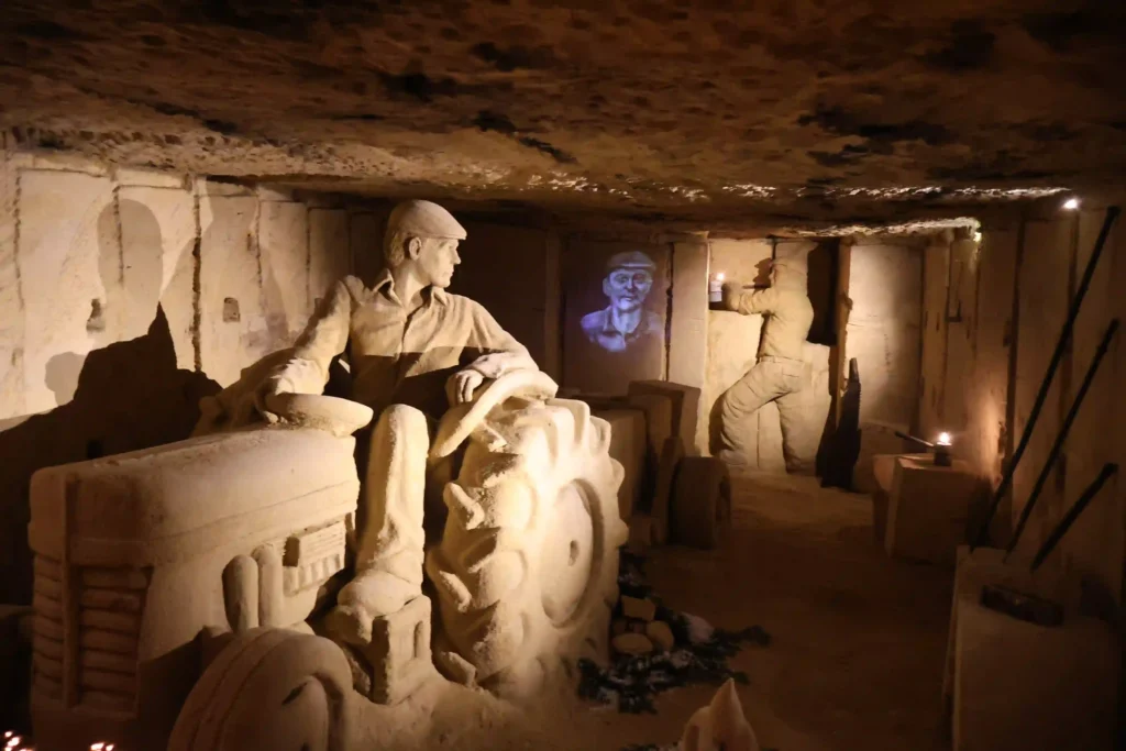 De grot vertelt ook het verhaal van de mensen die hier hebben gewerkt. We zagen het borstbeeld van Emile Caselli, oprichter van de Steenkolenmijn van Valkenburg in 1937, omringd door mergelstenen. Het standbeeld van de “blokbreker”, een eerbetoon aan de mijnwerkers, stond naast een verlichte kerstboom. Een mooie verbinding tussen de geschiedenis van hard werken en de vreugde van kerst.