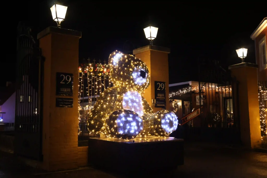 Het park baadde in een warme gloed van duizenden kerstlampjes. Bij de entree stonden we even stil voor de imposante kerstboom met gouden en rode versieringen. Verlichte strikken en bogen langs het pad, overal twinkelden lichtjes. De kerstsfeer was meteen voelbaar.