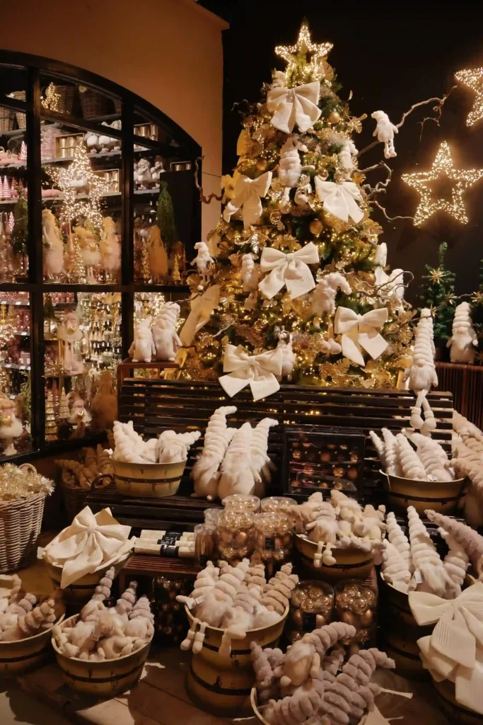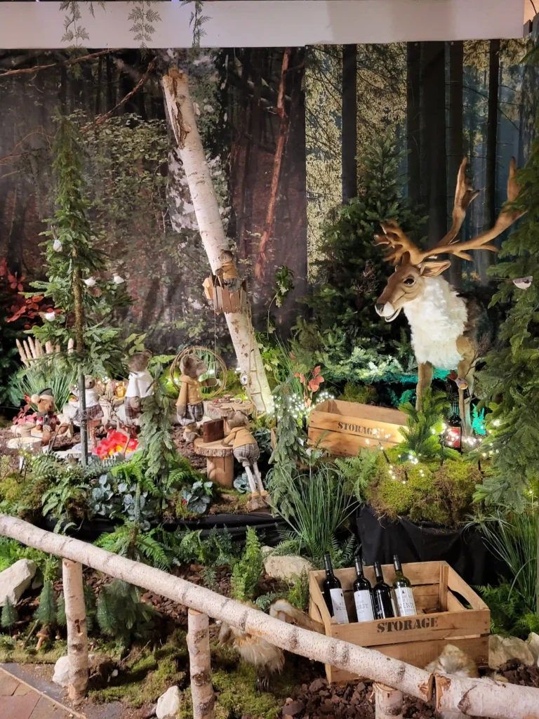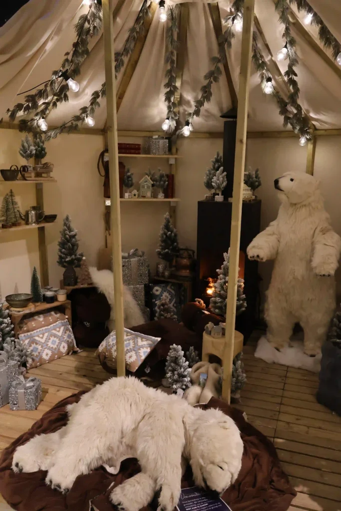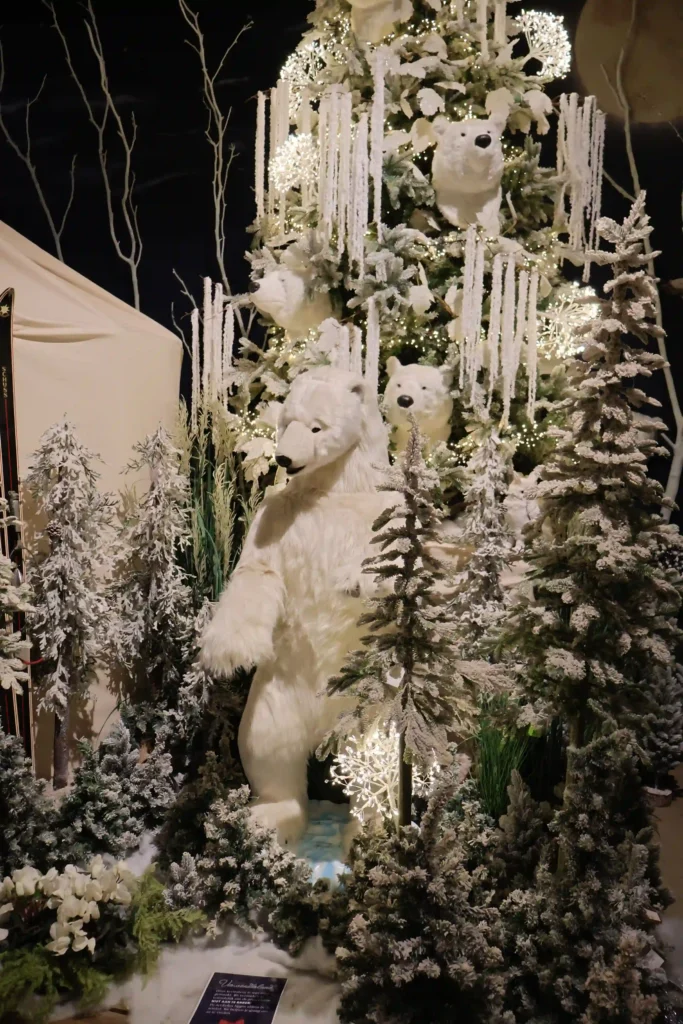 We moeten beginnen met het display dat ons letterlijk deed stoppen en staren: het ijsberenthema. Levensgrote witte ijsberen, complete winterbomen met ijspegels, en een sfeer alsof je echt in het arctische gebied staat. Het mooiste? De luxe tent met witte stoffen draperie aan het plafond, versierd met dennentakken en warme lichtjes. Daaronder een compleet winterlandschap met verschillende ijsbeerfiguren, van grote imposante beren tot schattige kleintjes. Alles in wit, creme en zilver. De details waren perfect: besneeuwde takken, witte bloemen en overal die magische glinstering. Dit was echt een hoek waar je even bleef hangen. Zo’n display waar je denkt: “Dit wil ik thuis!” (Al is de woonkamer misschien net te klein voor die levensgrote ijsbeer…)