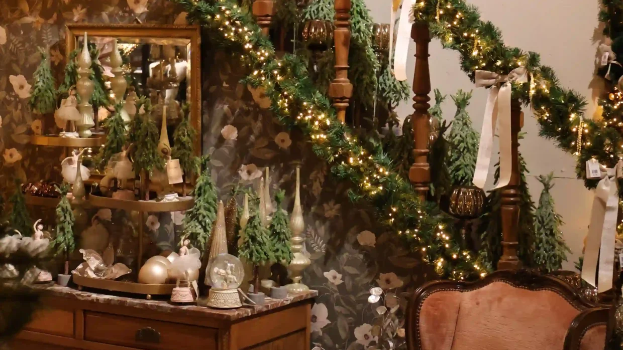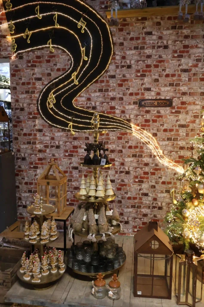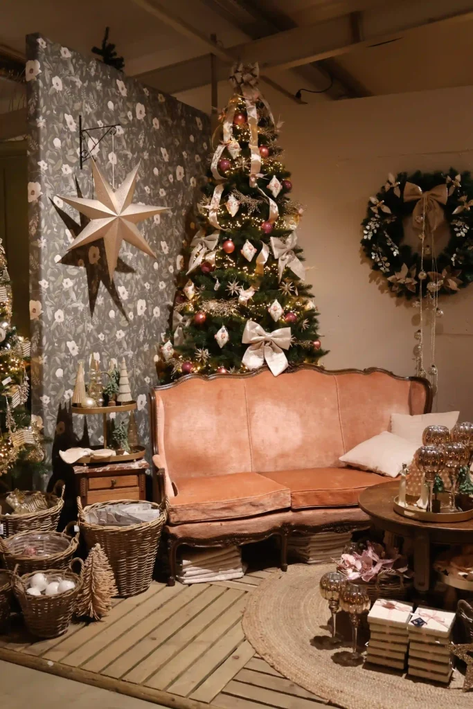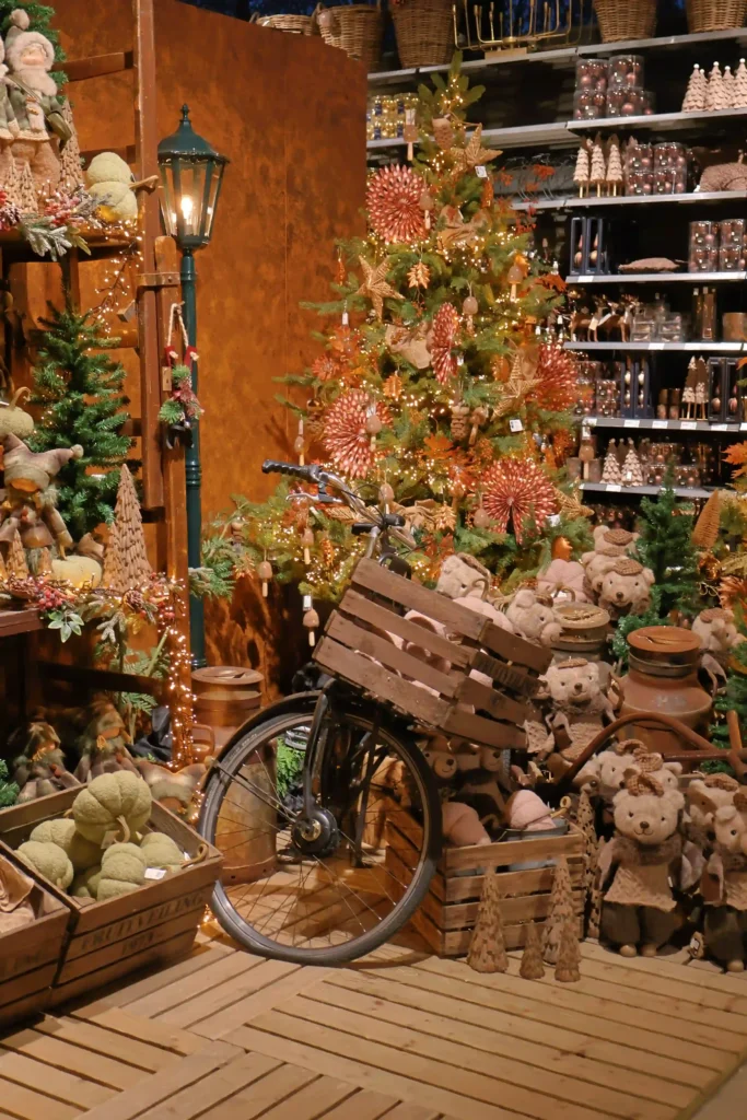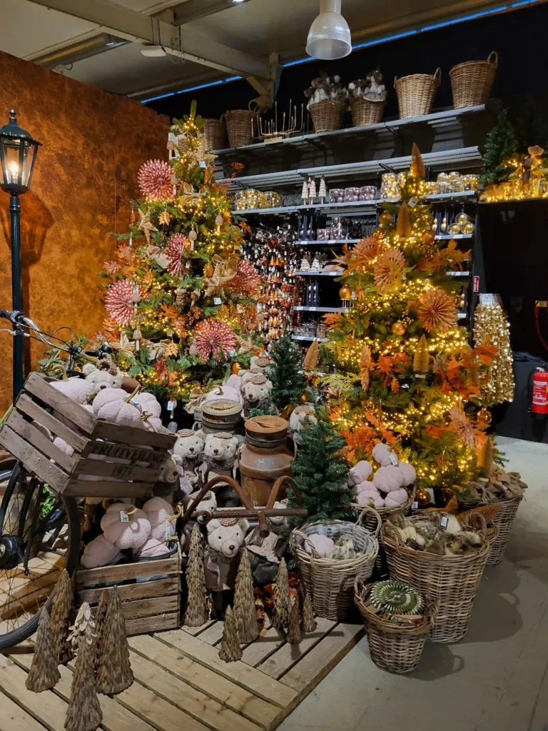 Een ander opvallend display was de vintage hoek met een oude houten bakfiets vol decoraties. De kerstboom erboven was versierd in terracotta, roze en natuurlijke tinten, met stropoppenbloemen als eyecatcher. Zo’n origineel idee dat je niet snel elders ziet, en perfect voor wie houdt van dat nostalgische, landelijke gevoel met een modern tintje.