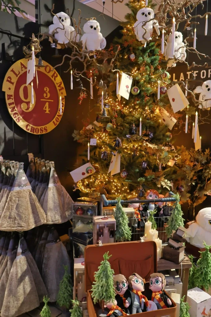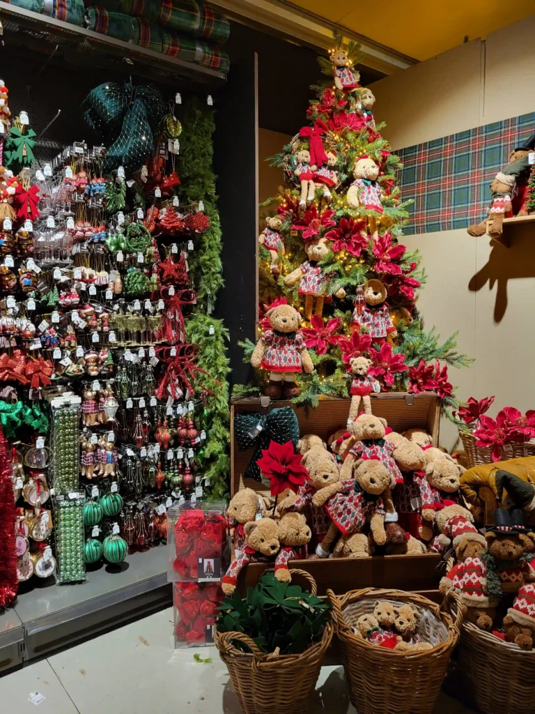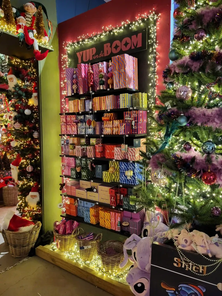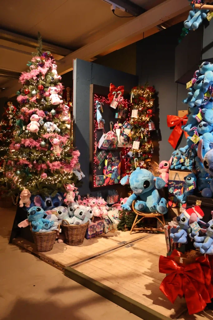 We kunnen natuurlijk niet voorbij gaan aan de Stitch en Angel collectie! Een complete roze boom vol met Stitch knuffels en decoraties. Maar ook de elfjeshoek met stapelbedden, bengelende beentjes en rood-groene outfits was schattig. De kerstman’s werkplaats in miniatuur! En dan was er nog dat enorme rode object aan het plafond (we zijn er nog steeds niet uit wat het precies moest voorstellen!) met daaronder een complete candy cane explosie. Rood-wit gestreept, sneeuwpoppen, rendieren, alles wat hoort bij dat traditionele kerstgevoel maar dan in overdrive. Leuk detail: de stapel Franse bulldogs met kerstmutsen, letterlijk op elkaar gestapeld als een levende kerstpiramide!