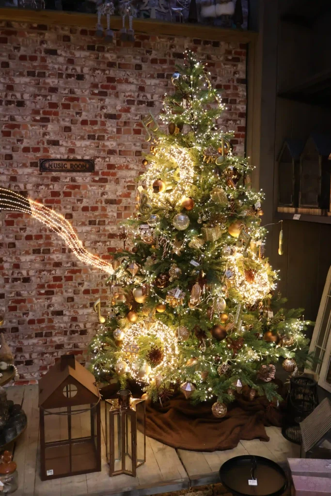 Voor een compleet andere sfeer was er de industriële hoek met een bakstenen muur als backdrop. Een gouden kerstboom omringd door grote lantaarns, een verlichte ster en stoere metalen accenten. Dit is kerst voor wie houdt van urban, robuust en net even anders dan de standaard landelijke stijl. De combinatie van ruw en glitter werkte verrassend goed!
