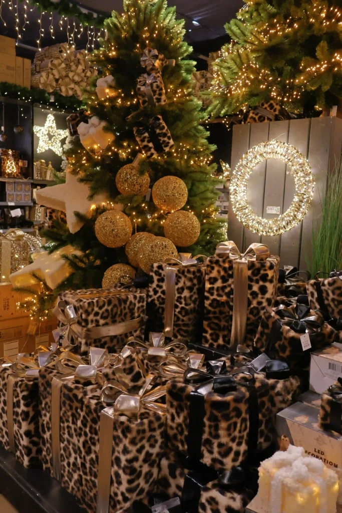 Ja, je leest het goed. Intratuin durft! We kwamen een hoek tegen met gouden glitterbomen, enorme gouden ballen en daaronder… cadeaus verpakt in leopard print. Zwarte accenten, gouden versierselen en verlichte kransjes completeerden het geheel. Super luxe, een beetje edgy, en absoluut niet voor de brave hendrik. Maar wij vonden het geweldig! Soms moet kerst gewoon een statement maken.