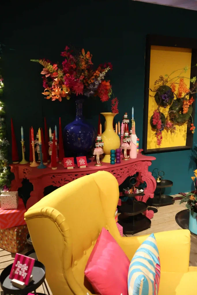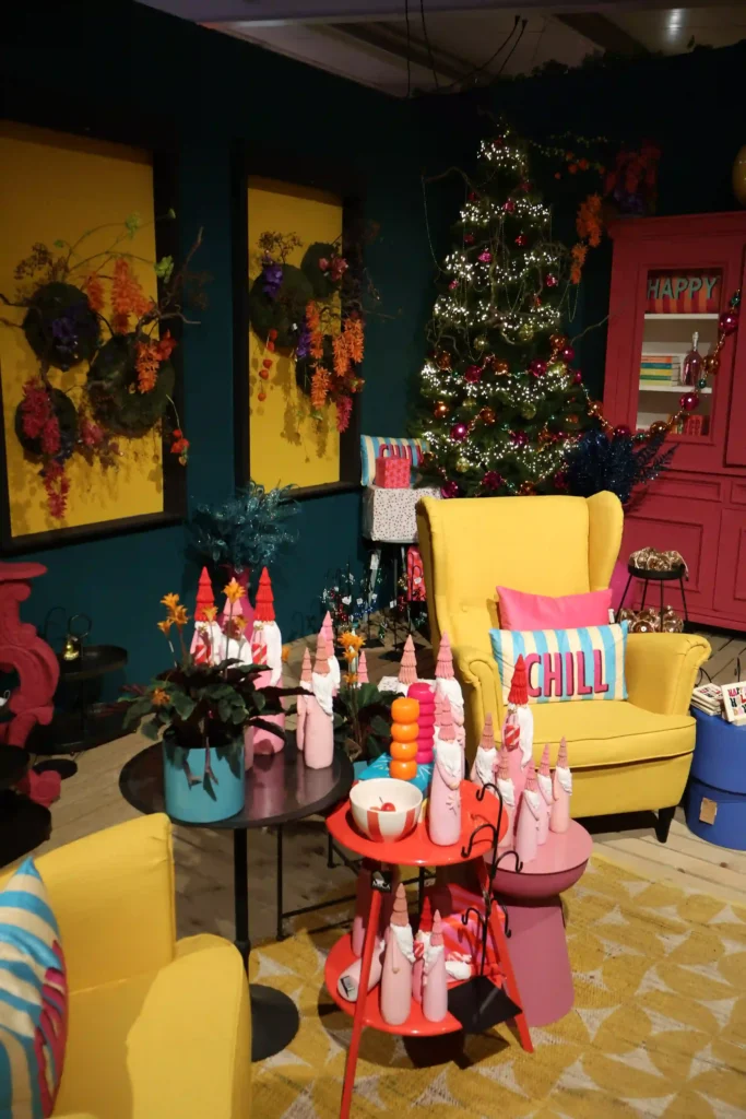 Complete tegenpool van het ijsberenthema, maar minstens zo leuk: de ultra kleurrijke hoek! Denk aan een knalgele oorstoel met felroze en turquoise kussens waarop woorden als “CHILL” en “HAPPY” staan. Ernaast een knalrode kast met kleurrijke decoraties en een boom vol met gekleurde ballen. Dit is kerst zonder regels. Geen traditioneel rood-groen, maar juist felle kleuren die je blij maken. Perfect voor wie houdt van speels, modern en een beetje rebels. We zagen paarse, oranje, roze en gele accenten, en het werkte verrassend goed samen!