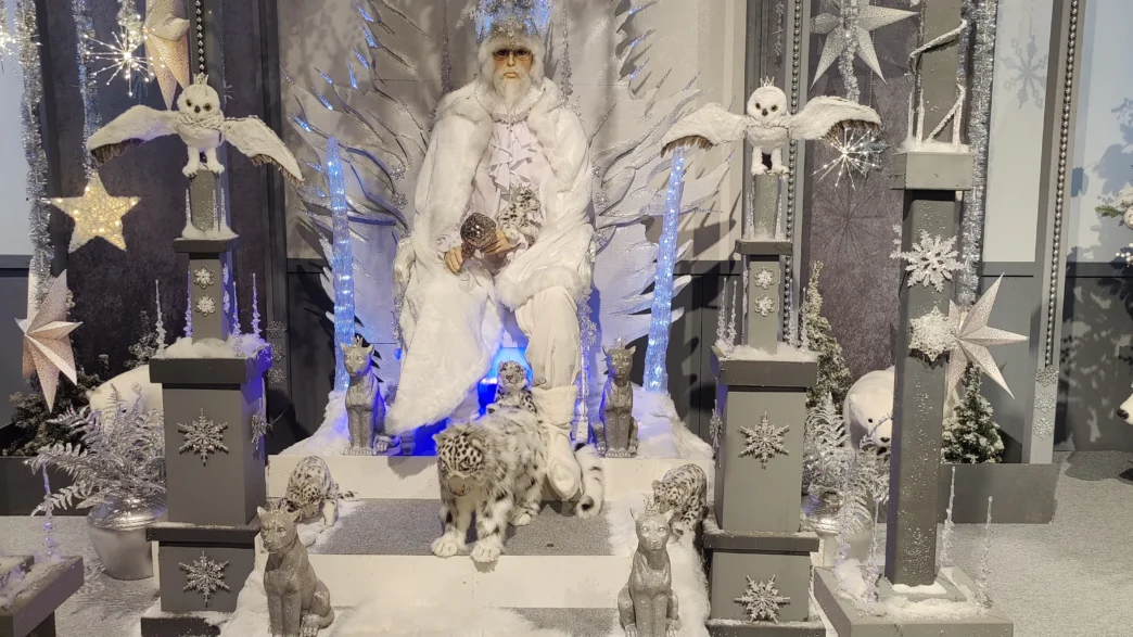 Daarnaast schittert de ijskoning in een majestueuze, witte setting. Met een troon omringd door glinsterende sneeuwuilen, elegante ijsberen en fonkelende lichtstaven waan je je in een winterwonderland. Deze scene is niet alleen prachtig om naar te kijken, maar biedt ook een perfect moment voor een sfeervolle kerstfoto. De wensvijver ervoor geeft je de kans om een wens te doen – wie weet komt hij deze kerst uit!