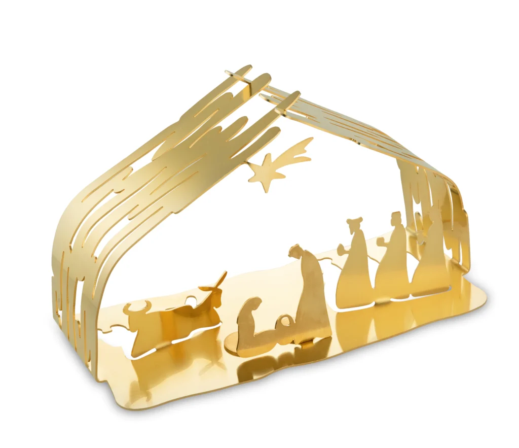 Ontworpen door Michael Boucquillon en Donia Maaoui, is deze opvallende kerststal een prachtig middelpunt voor je decoratie. Gemaakt uit één stuk roestvrij staal en afgewerkt met 24-karaats vergulding, combineert het traditionele symboliek met een moderne uitstraling.