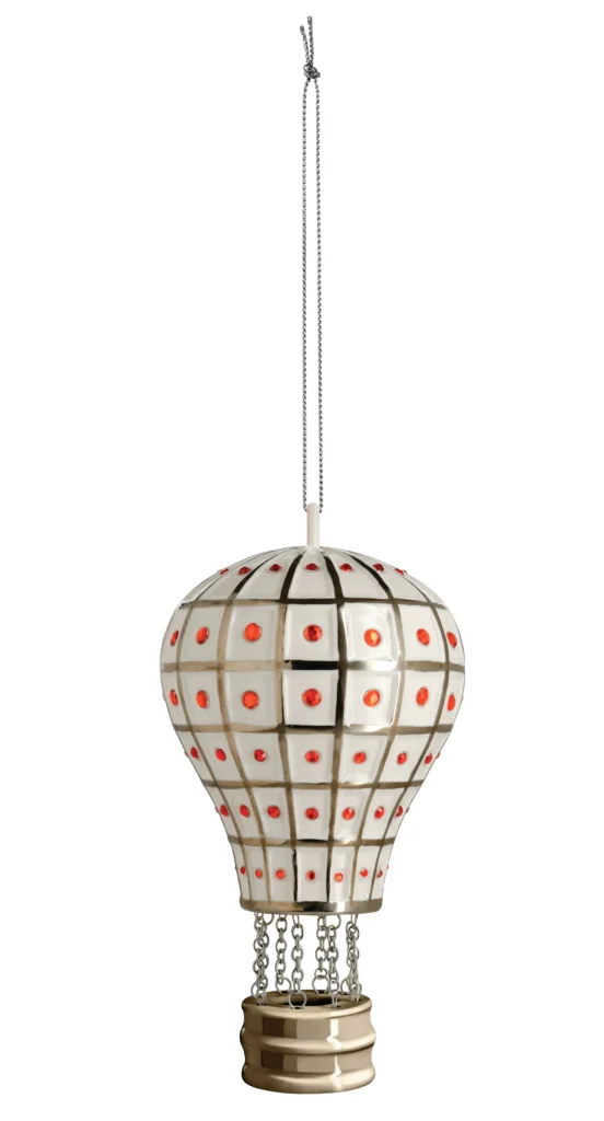Ontworpen door Marcello Jori, combineert dit charmante luchtballon-ornament verfijnde porseleinkunst met handgeschilderde details en zilveren accenten. Een speelse toevoeging aan je kerstboom of tafeldecoratie.