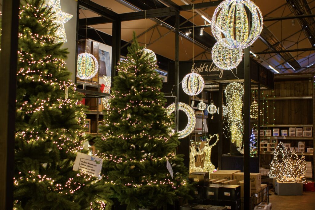 Verderop kom je langs een indrukwekkende selectie kerstverlichting. Het aanbod varieert van simpele, klassieke lichtjes tot uitgebreide, sfeervolle lichtobjecten in de vorm van sterren, herten en kerstbomen. De manier waarop alles is uitgestald geeft je direct een idee van hoe je thuis een feestelijke sfeer kunt creëren. Het is bijna onmogelijk om niet geïnspireerd te raken en je voor te stellen hoe jouw huis eruit kan zien met dezelfde fonkelende lichtjes.