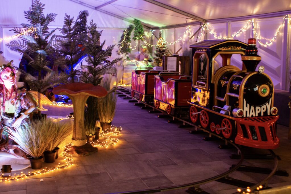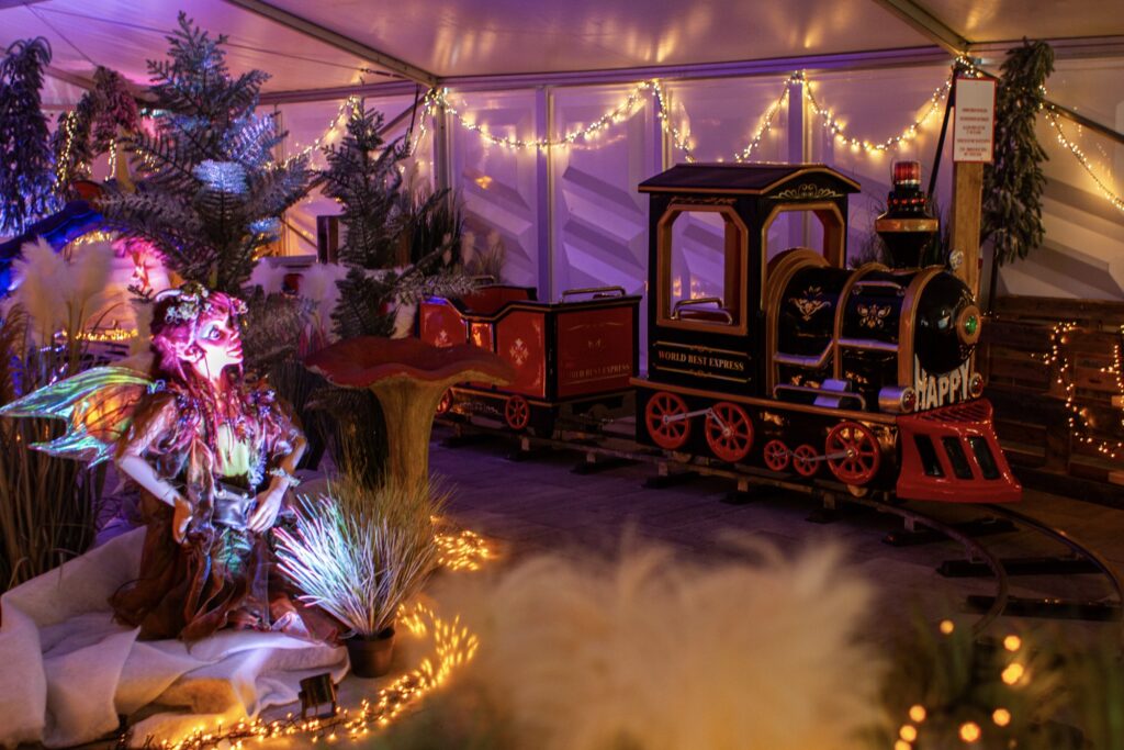 Wat deze kerstshow echt uniek maakt, is het kleine treintje dat rustig zijn rondjes rijdt in de buurt van het tuincafé. Het is een prachtig detail dat vooral de jongste bezoekers enthousiast maakt, maar ook bij volwassenen de nodige nostalgische gevoelens oproept. Terwijl het treintje voorbij tuft, hoor je het vrolijke gelach van kinderen en zie je hun ogen twinkelen, net als de lichtjes die overal om je heen hangen. Dit stukje beleving brengt echt iets bijzonders met zich mee – alsof je voor even teruggaat naar de kerst van vroeger, waar alles magisch en groots aanvoelde.