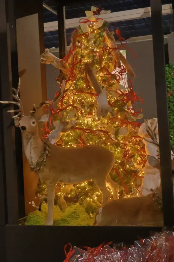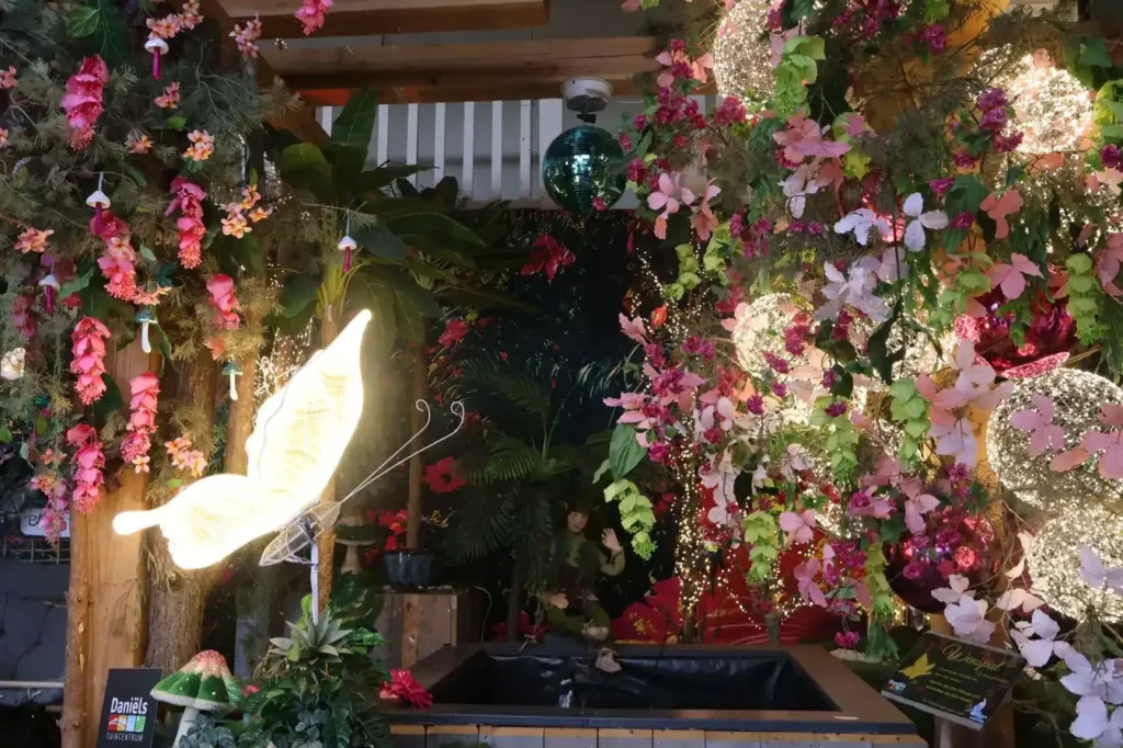 Al bij de entree word je verwelkomd door een lichtgevende vlinder tussen tropische bloemen en exotische planten. Het is een eerste hint naar wat komen gaat, want dat vlindermotief duikt door de winkel nog een paar keer op. Het geeft het geheel meteen een speelse, bijna dromerige sfeer. Geen standaard kerstgevoel, maar iets magisch.