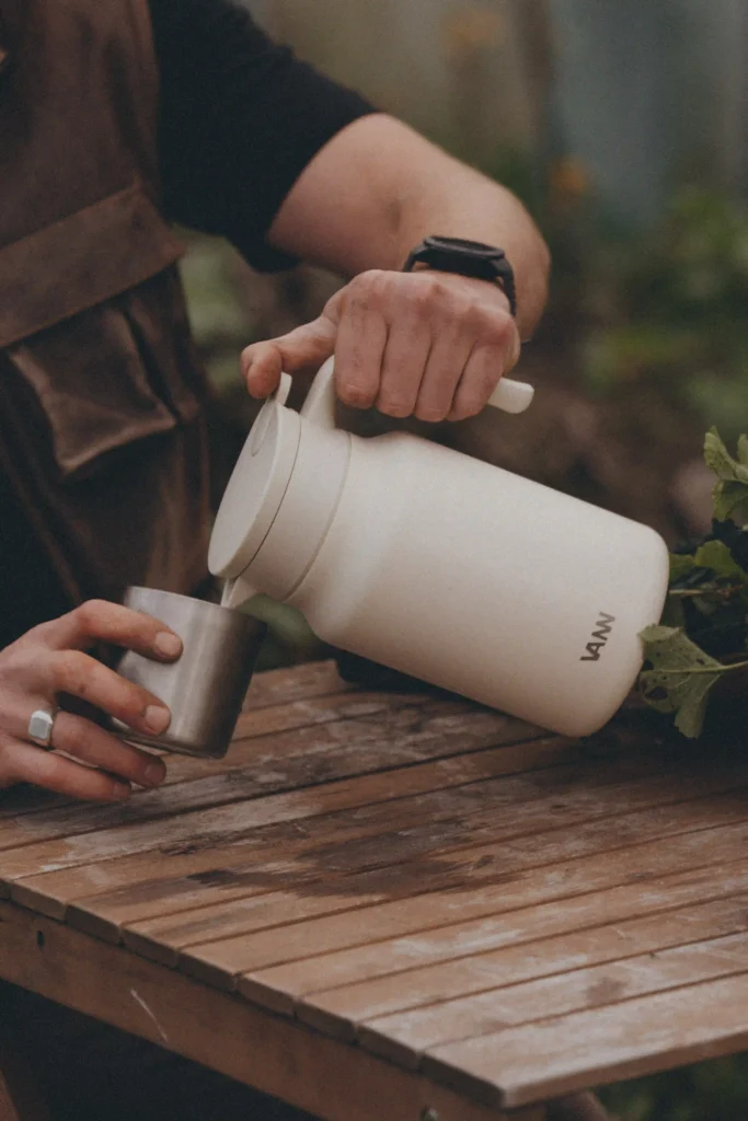 Laatste maar zeker niet minste: de VANN Family Jug in off white voor €49,90. Dit is wel de duurste van het stel, maar ook echt een investment piece. Zondagochtend, grote kan verse koffie erin. We zitten een paar uur aan tafel met de kinderen, spelletjes, pannenkoeken, het hele weekend ritueel. Die koffie blijft gewoon warm. Niet lauw, maar echt warm. En dat drukknopsysteem is zo makkelijk dat zelfs mijn zevenjarige zonder morsen kan inschenken. Wat me ook opvalt: hij ziet er gewoon mooi uit op tafel. Niet zo’n lelijke thermosfles die je liever verstopt, maar eentje die bij je servies past.
