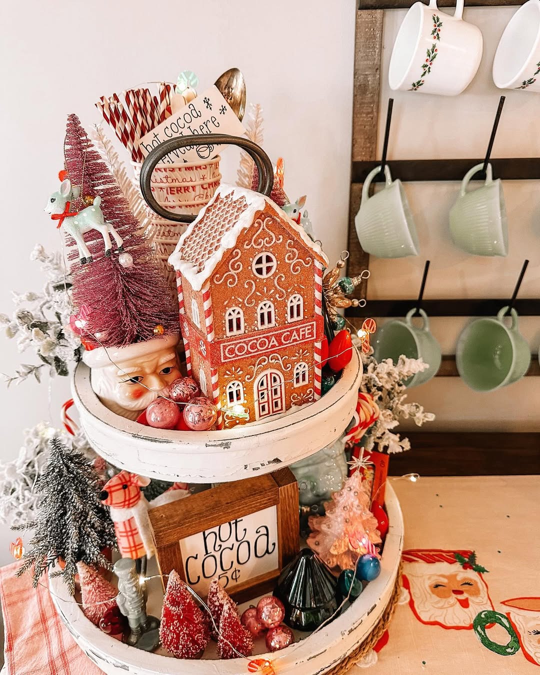 Toen ik de foto’s van Olivia (@livyludecorates) voor het eerst zag, voelde het alsof ik in een snoepwinkel stapte. Alles aan haar hot cocoa corner ademt kerstvreugde. Een tiered tray gevuld met roze boompjes, blinkende ornamenten, zuurstokken en een gingerbread huisje dat zo van een kerstfilmset lijkt te komen. Dit is precies het soort hoekje waar je op koude dagen met een dampende mok chocolademelk wil gaan zitten.